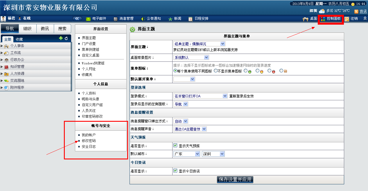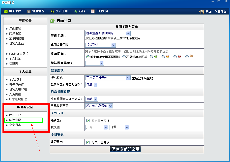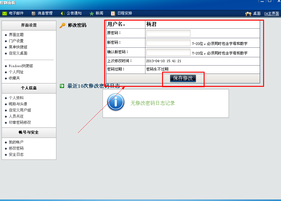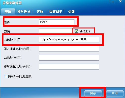 (4)OA地址(內網(wǎng))修改成下面內容[changanwuye.gicp.net:800]。用戶名首次登陸為自己的名字,沒有密碼。點擊保存。就可以直接登錄了。