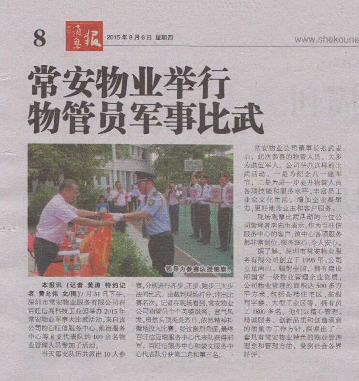 在2015年八一建軍節(jié)即將來臨之際,公司上下歡聚在百旺信高科技工業(yè)園,舉辦軍事隊(duì)列比武,一方面慶祝中國(guó)人民解放軍建軍88周年,另一方面向大家宣傳強(qiáng)身健體的觀念,同時(shí)向各位業(yè)主展示公司秩序維護(hù)隊(duì)伍的專業(yè)性和可靠性。每個(gè)服務(wù)中心代表隊(duì)都意氣風(fēng)發(fā)、斗志昂揚(yáng),充分展示了自己的實(shí)力,收獲了屬于自己的榮譽(yù)。